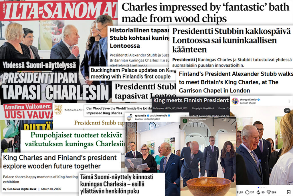 Kuningas Charlesin ja Suomen presidenttiparin Alexander Stubbin ja Suzanne Innes-Stubbin vierailu Suomen Metsäyhdistyksen järjestämässä Uusi puu -näyttelyssä toi suomalaisille puuinnovaatioille valtavan mediahuomion kansainvälisesti ja Suomessa.