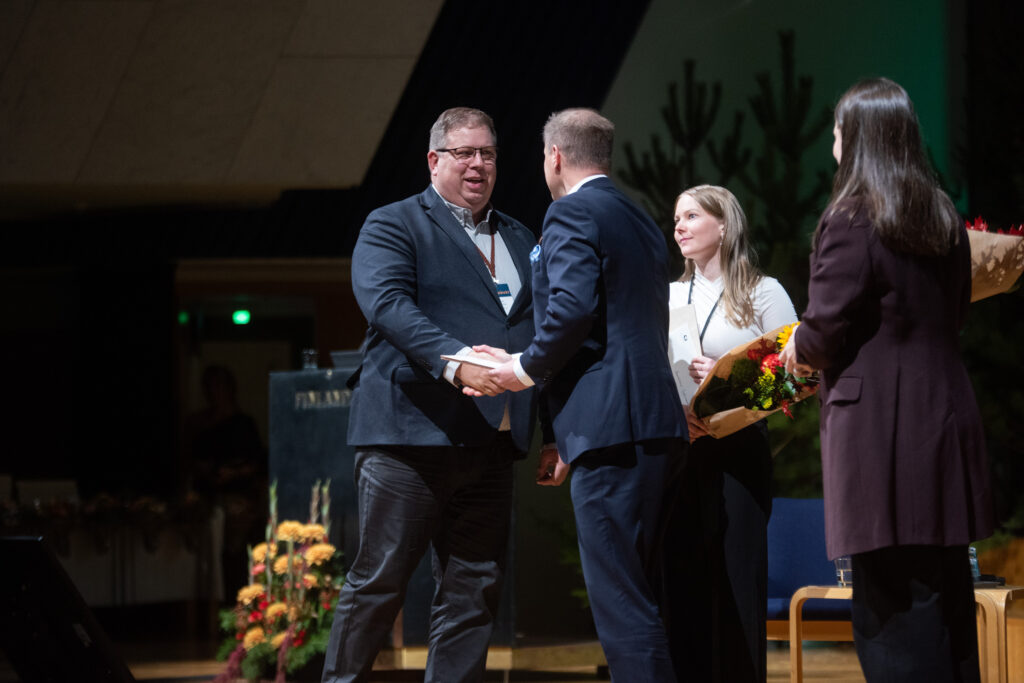Säätiön hallituksen puheenjohtaja Petri Vanhala ja Suomen
