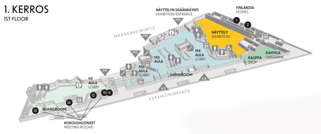 - Mannerheimintie: ovet M1 (kongressisiipi), M3 ja M4 (pääovi)
